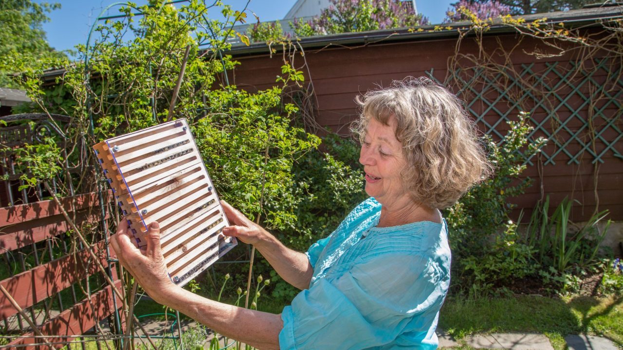 Sigrid-Ann Mortensen trekker varsomt ut det hjemmesnekrede insekthotellet på husveggen i en frodig villavei på Nordstrand. Den geskjeftige bien enser oss ikke, men bygger videre på redet rundt pollenmatpakken som venter når egg blir til biebarn – larver.