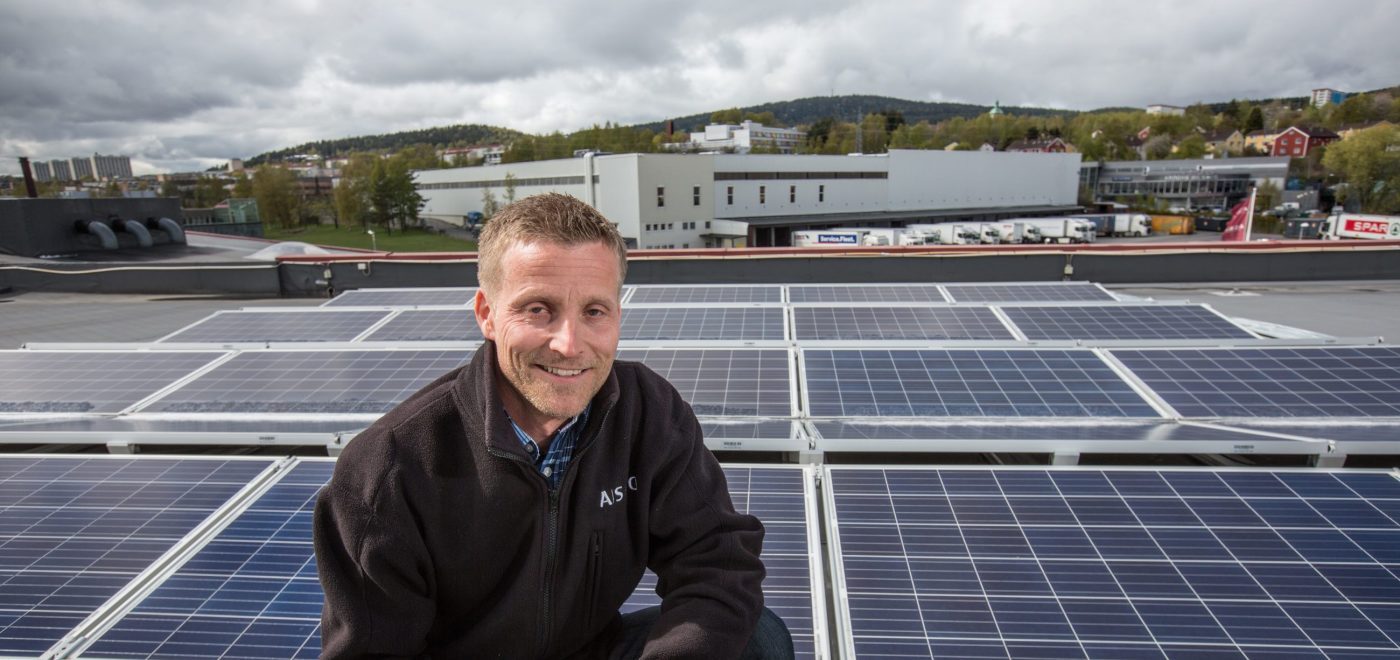 Aleksander Jørgenrud smiler bredt når han forteller hvor mye strøm Asko sparer på sitt solcelletak. Sjekk hvordan du og bedriften kan tjene penger på taket.