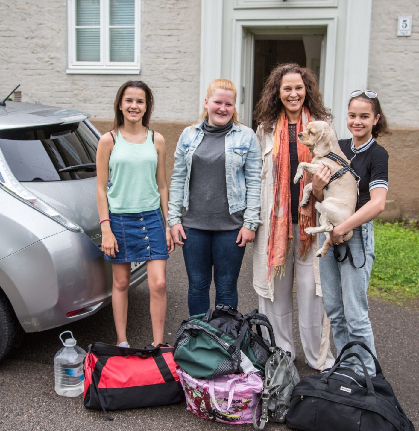 – Dere skulle vært her forrige uke, da stappet vi bilen full av bambuspalmer. Jentene satt i en skog i baksetet, ler Monica, og plasserer den siste bagen i bagasjerommet, før hun stabler seg selv, sine to døtre, barnas venninne Marte Linderud (13) og firbeinte Mio i bilen, og triller stille og fløyelsmykt ut av bakgården på Lindern, i retning sol og salt sjø.