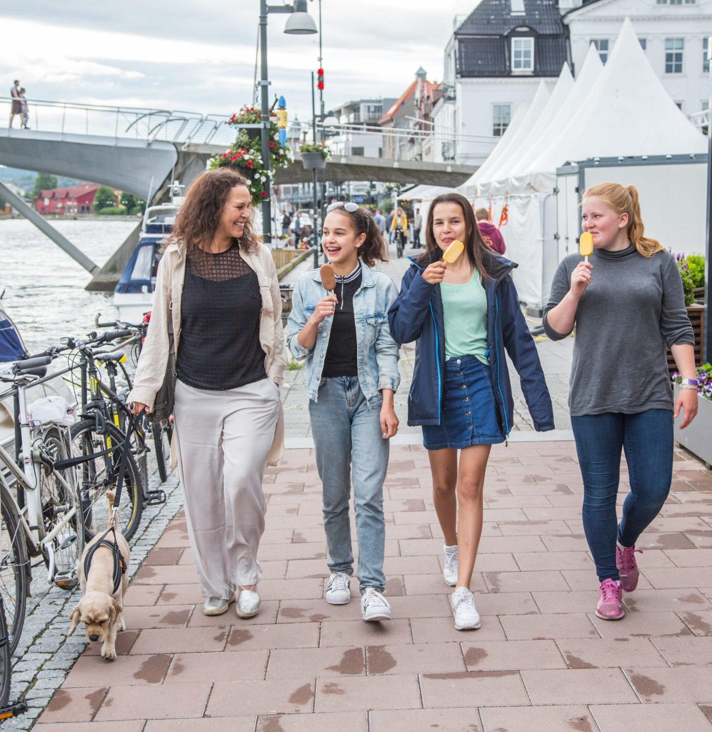 Mens elbilen lader i Apenesfjellet parkeringsgarasje, nyter Monica, Amo, Isa og Marte en is på brygga i Fredrikstad.