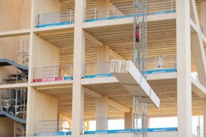 Slik ser det ut når et bygg bygges av massivtre! Mjøstårnet i Brumunndal er under oppføring, og skal bli verdens høyeste trehus! 80 meter høyt og 18 etasjer. (Foto: Anne-Line Bakken/Moelven)
