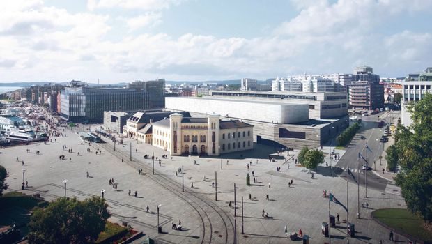 Det nye Nasjonalmuseet reiser seg bak den gamle stasjonsbygningen til Vestbanen. Foto: Klimaetaten