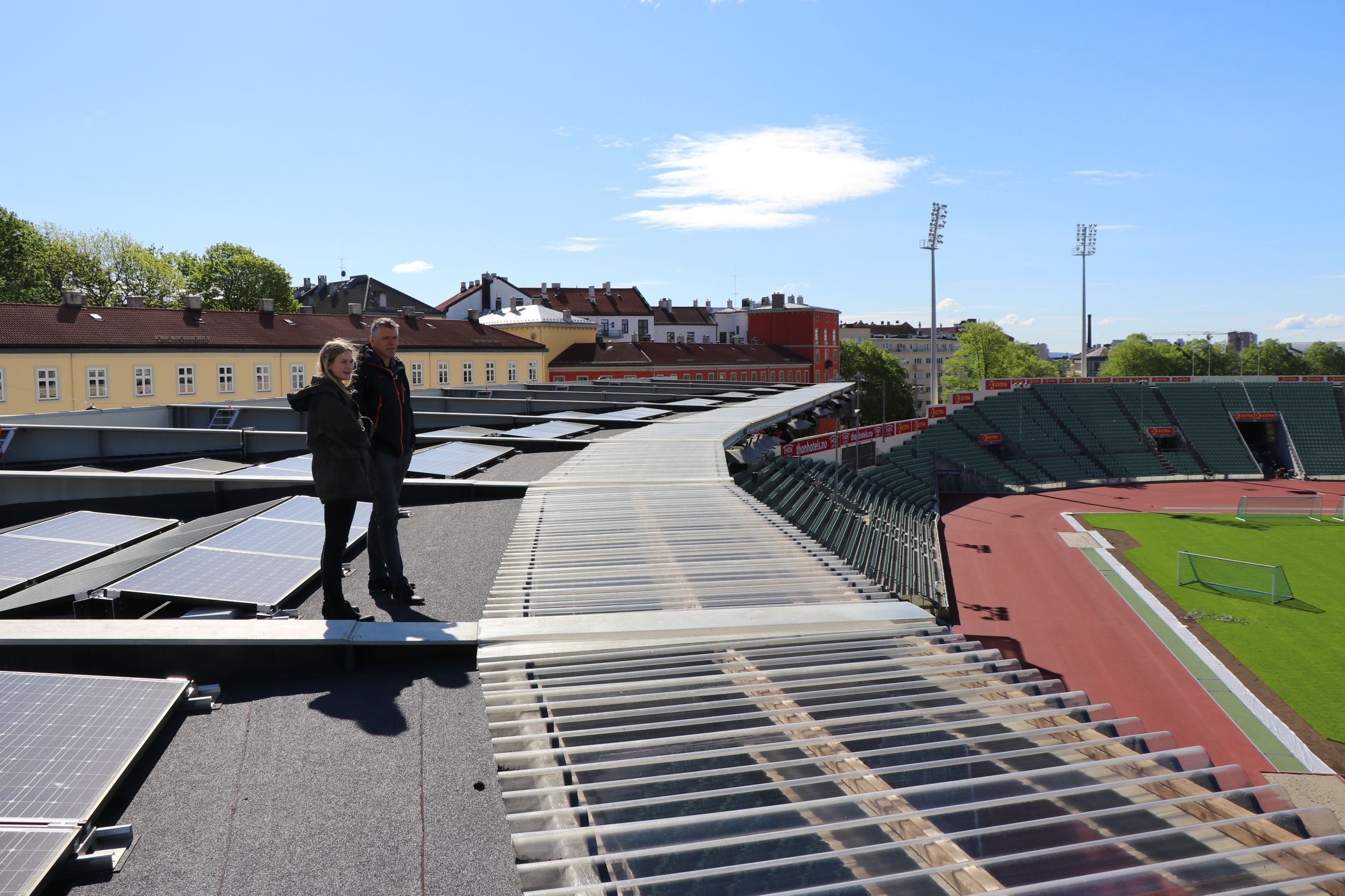 Ida Christine Løland og Ståle Ottesen i Kultur og idrettsbygg i Oslo kommune ser utover solcelleanlegget som dekker taket av Bislett stadion. Det er det første idrettsanlegget som fikk solcelleanlegg i Norge.