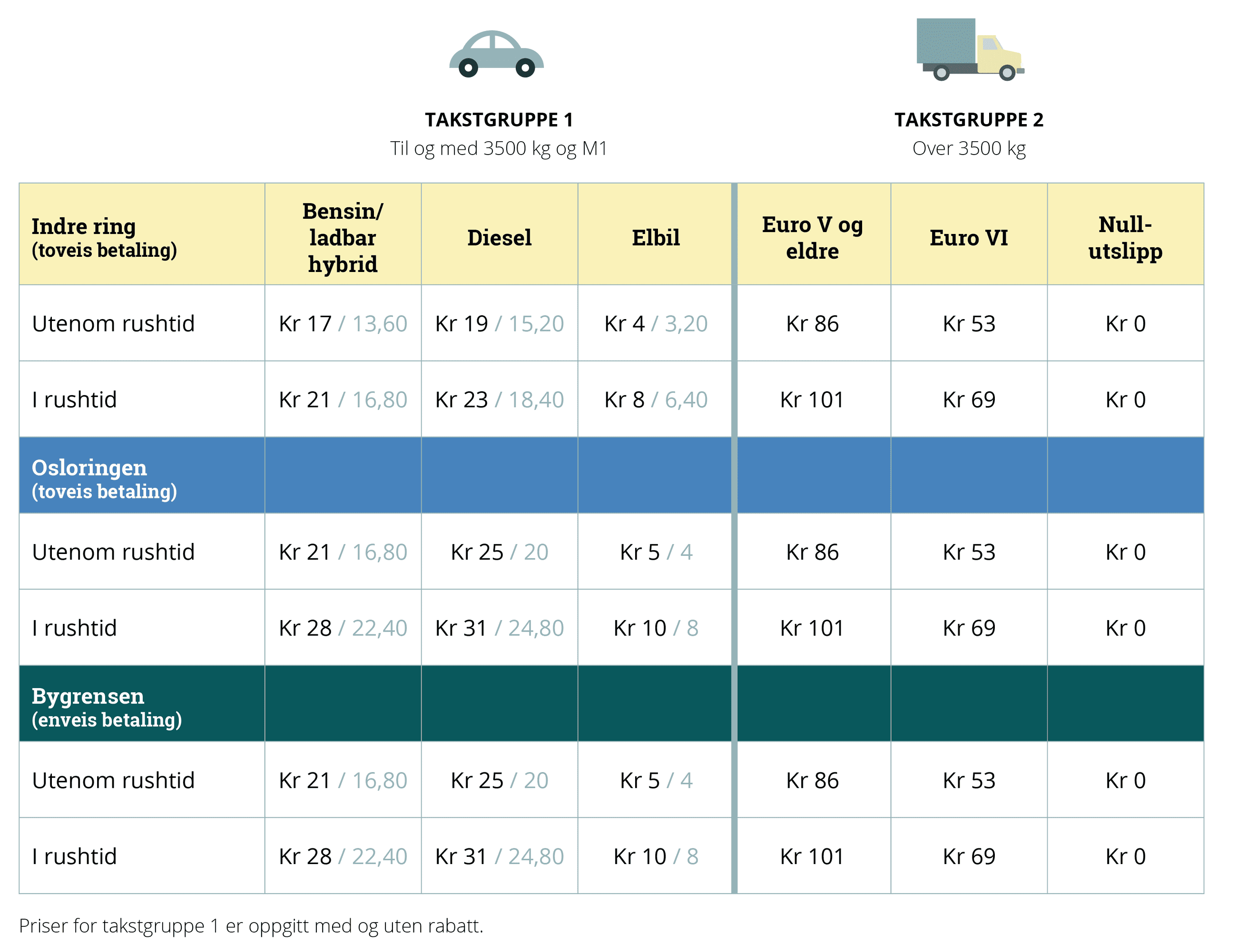 Samtidig ble det dyrere å kjøre diesel- eller bensinvarebil etter 1. juni 2019. Fra 1. juni har en en varebil med Euro V eller eldre standard i rushtiden måttet betale 101 kr i Indre ring, Osloringen eller Bygrensen. Utenom rushen må samme varebil betale 86 kroner. En varebil med Euro VI standard må betale 69 kroner i rushen og 53 kroner utenom rushen.
