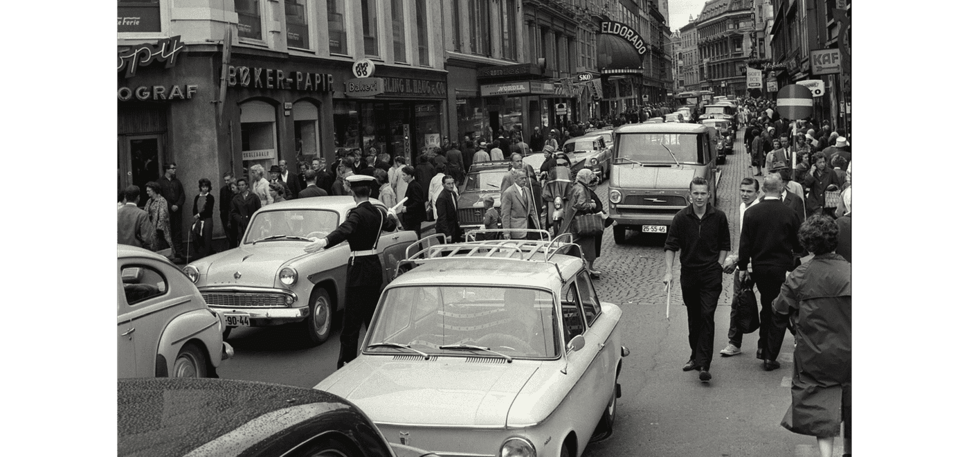Og slik kunne han holde på i noen år, men ikke mange. For veksten av biler økte jevnt og trutt. Allerede på 1950-tallet var bybildet drastisk forandret, og hester og fotgjengere måtte vike unna for stadig flere og raskere biler.