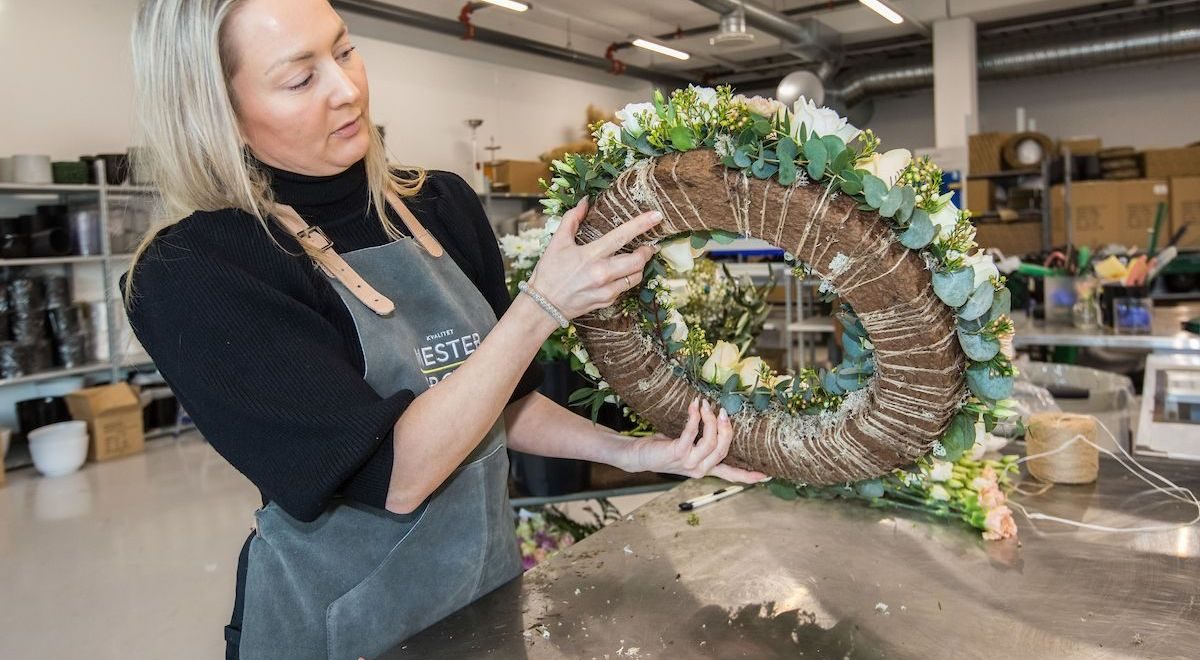 Nennsomt danderer blomsterdekoratør Tina Pedersen hvite knopper blant duse pasteller. Nok en vakker bårekrans er i produksjon hos Mester Grønn på Lier. Blomster som skal bære så mange følelser, når de snart skal bli med et menneske på den siste reisen.