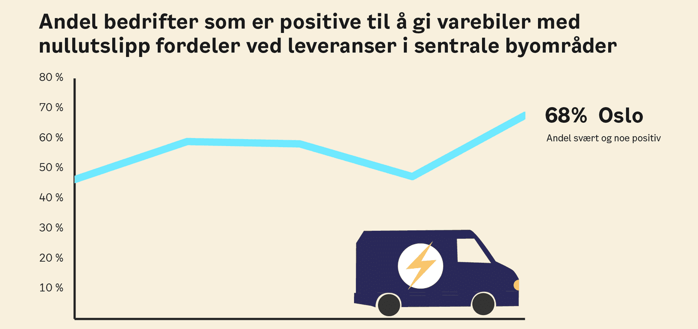 - 68 prosent sier at de er positive til å gi varebiler med nullutslipp fordeler ved leveranser i sentrale byområder (mot 46 prosent i 2018).