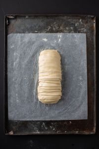 Ta deretter annenhver remse over til den andre siden, som om du svøper steken. Pensle så med plantemelk og stek til den er gylden.