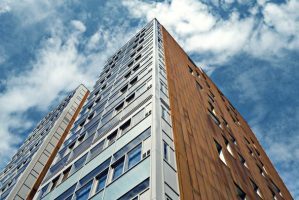 Treet i Bergen er en boligblokk i tre! Bygningen er i 14 etasjer og har 62 leiligheter. (Foto: Tor Orset/Moelven)