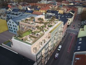 When the project is completed in the autumn of 2019, the timber building will have a green (living) roof and will be heated using 300-metre-deep geothermal wells (Illustration: Allianse Arkitekter).