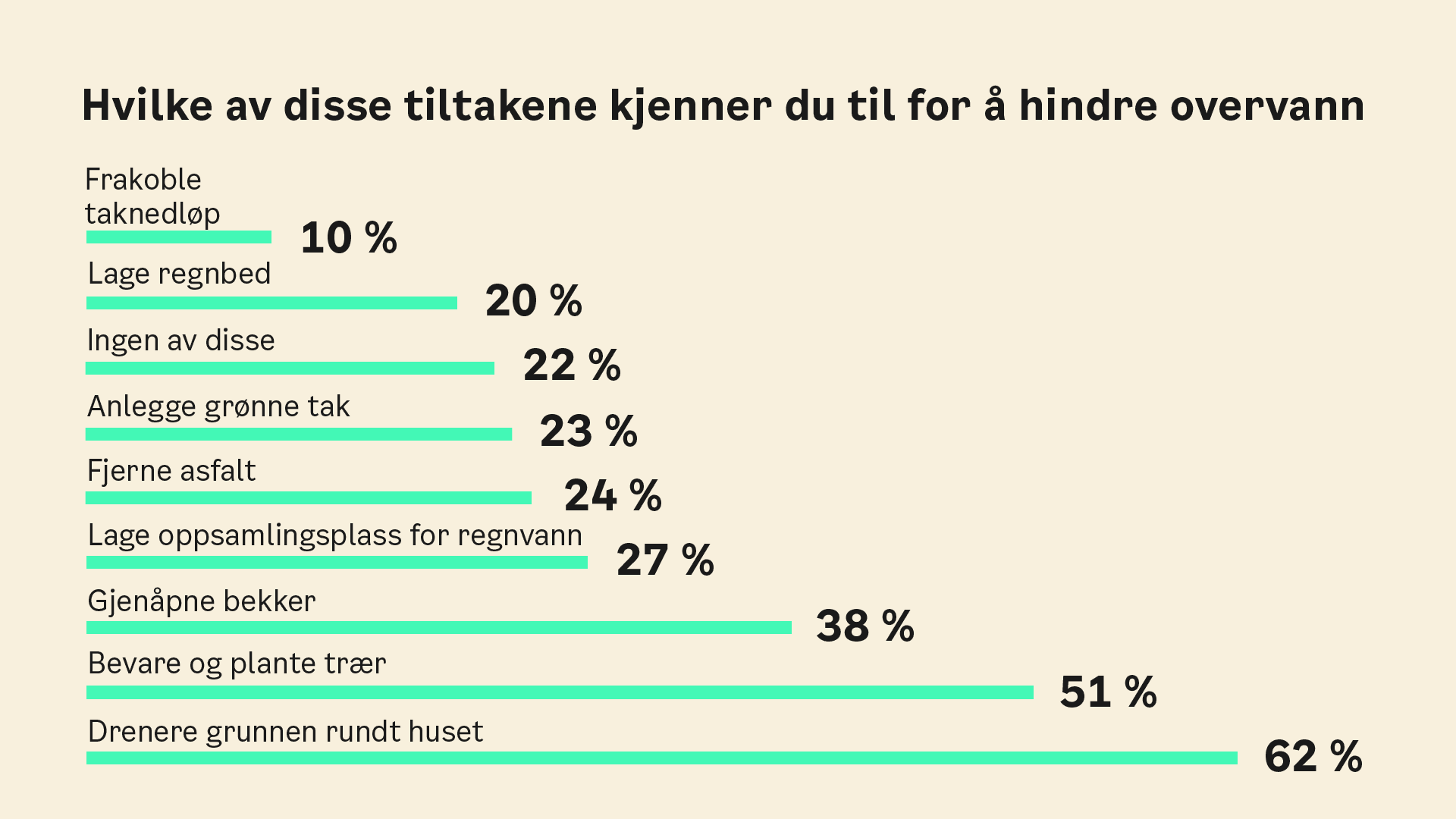 På spørsmål om hvilke tiltak for å hindre overvann befolkningen i Oslo kjenner til, har kjennskapen til følgende tiltak økt signifikant siden i fjor: lage regnbed, fjerne asfalt, bevare/plante trær og gjenåpne bekker.