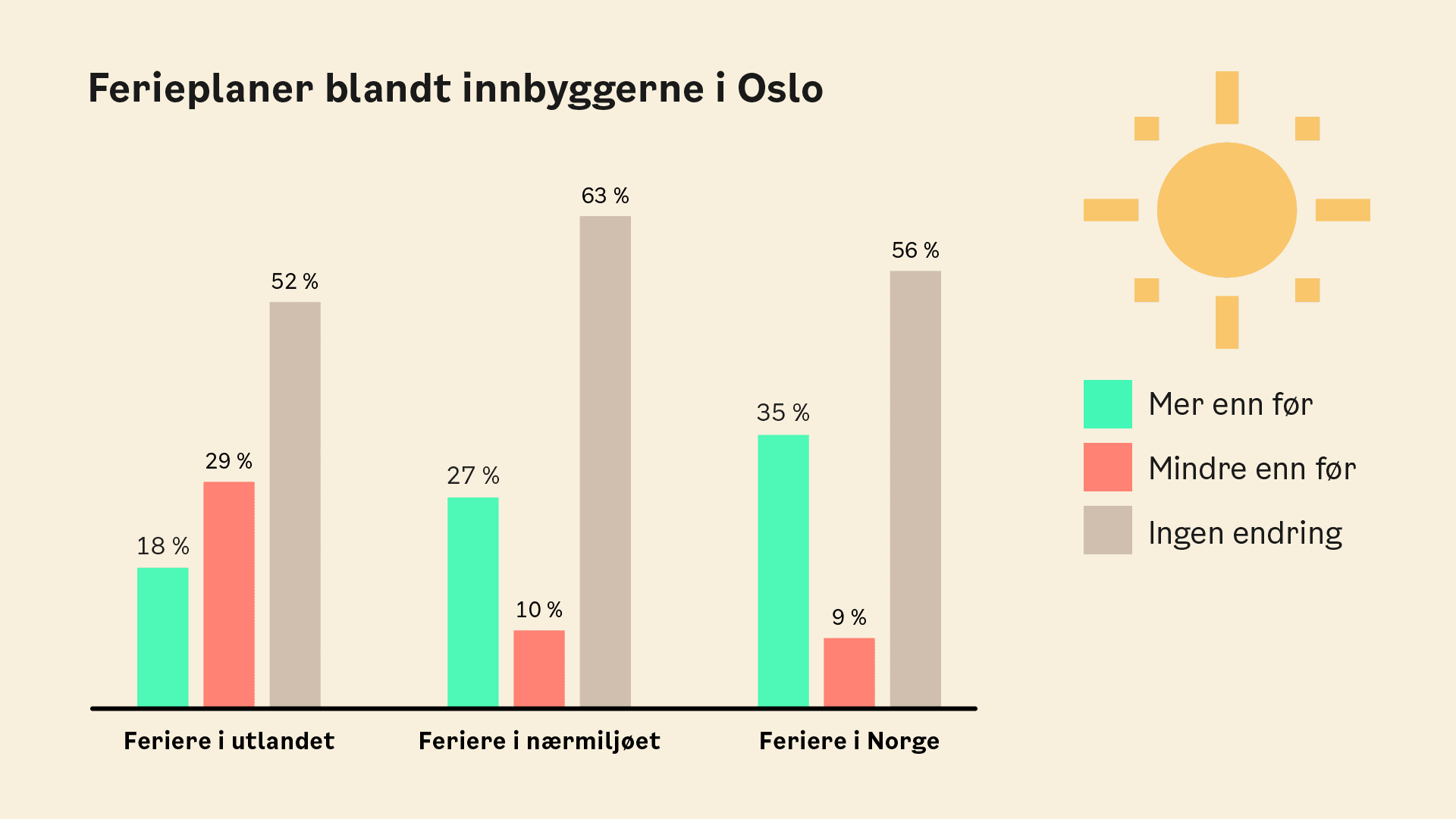 Omlag 1 av 4 i begge fylker sier at de vil fly mindre enn før pandemien. Det er ingen signifikante endringer fra i fjor, til tross for oppheving av koronarestriksjonene. Det er heller ingen signifikante endringer i andelen oslofolk som svarer at de vil feriere i utlandet sammenlignet med i fjor. Det er imidlertid en signifikant økning i Oslo som svarer at de vil feriere mer i nærmiljøet (27 prosent mot 22 prosent i 2021). Interessen for å feriere i nærmiljøet er størst blant de yngste innbyggerne og de som ikke disponerer bil.