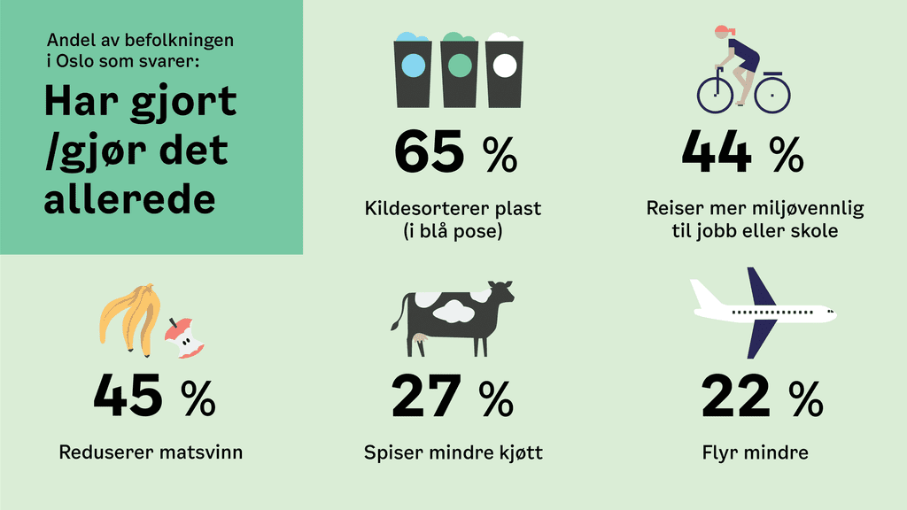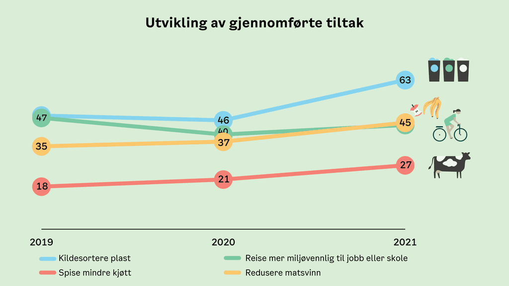 Vi ser en betydelig økning i andelen som har kildesortert og redusert matsvinn. Hele 63 prosent svarer at de allerede har kildesortert plast i blå pose, en oppgang fra 46 prosent fra i fjor. På spørsmål om hvor sannsynlig det er at folk vil kildesortere, svarer 61 prosent at de allerede kildesorterer. Det er en oppgang på 16 prosentpoeng fra i fjor. Det er også klart flere enn i fjor som mener de er blitt flinkere til å kutte matsvinn det siste året.
