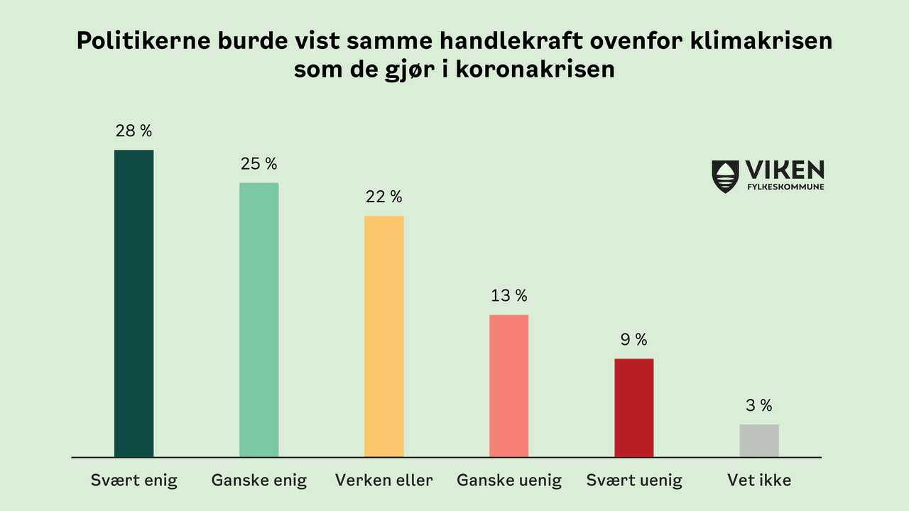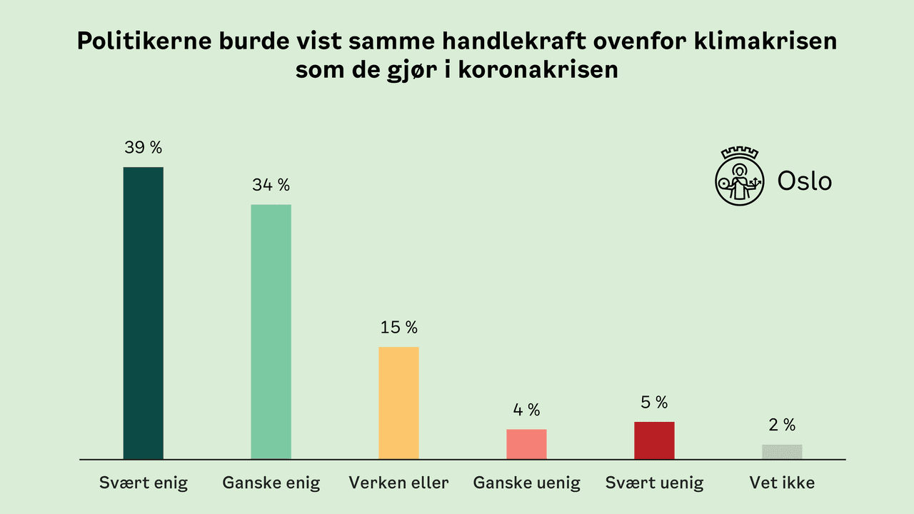 I Oslo oppgir halvparten (53 prosent) at politikerne burde vise samme handlekraft ovenfor klimautfordringer som ved pandemien. I gamle Akershus er samme andel på 47 prosent. Også her er den langt flere som sier seg enig enn uenig: I Oslo er 22 prosent uenige, mens i gamle Akershus er oppslutningen på 24 prosent.