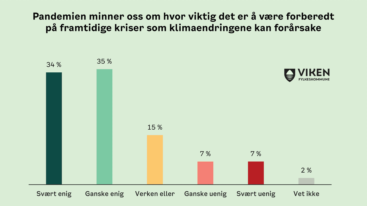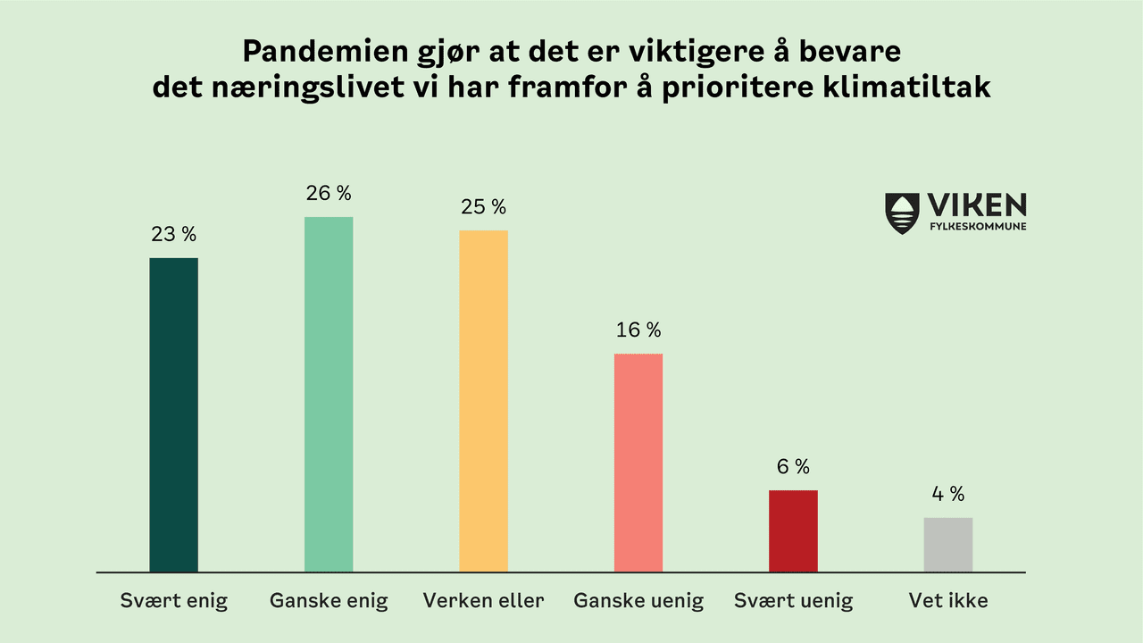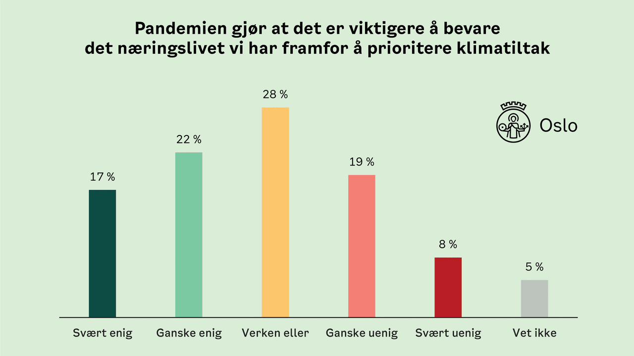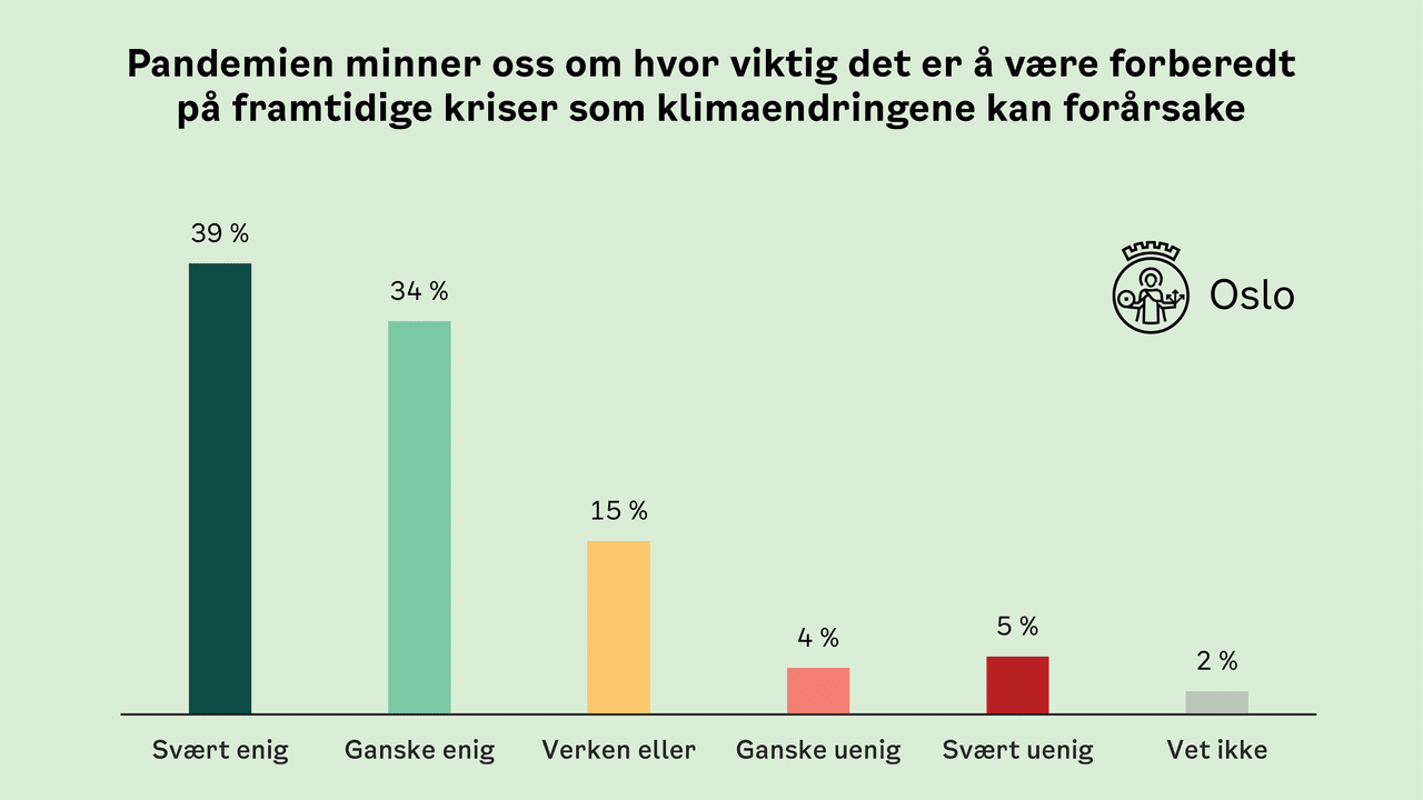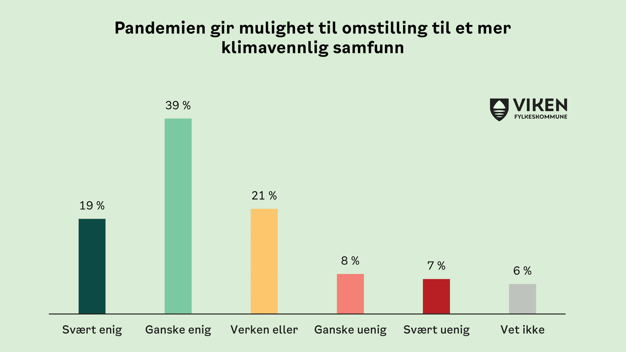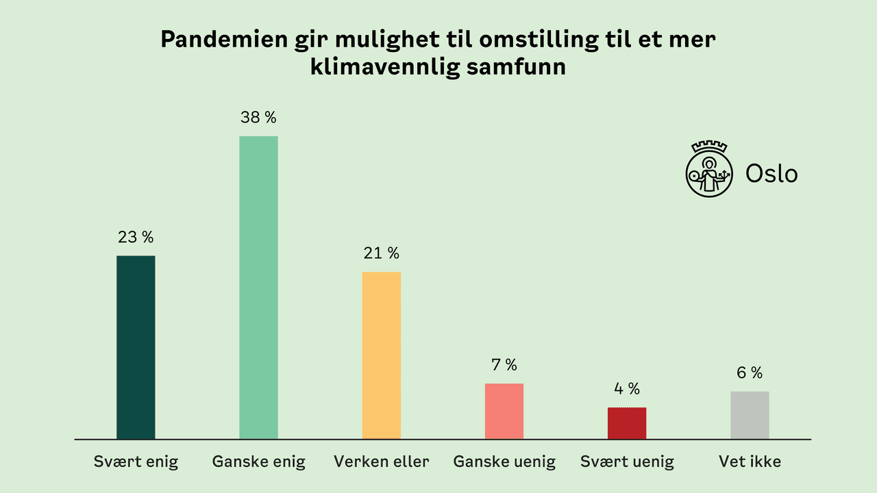 Om lag 6 av 10 mener at pandemien gir mulighet til omstilling til et mer klimavennlig samfunn, fordelt mellom 61 prosent enighet i Oslo og 57 prosent i nabokommunene. I begge områder er det langt flere som er enige enn uenige, hvor kun henholdsvis 15 prosent og 11 prosent sier seg uenig.