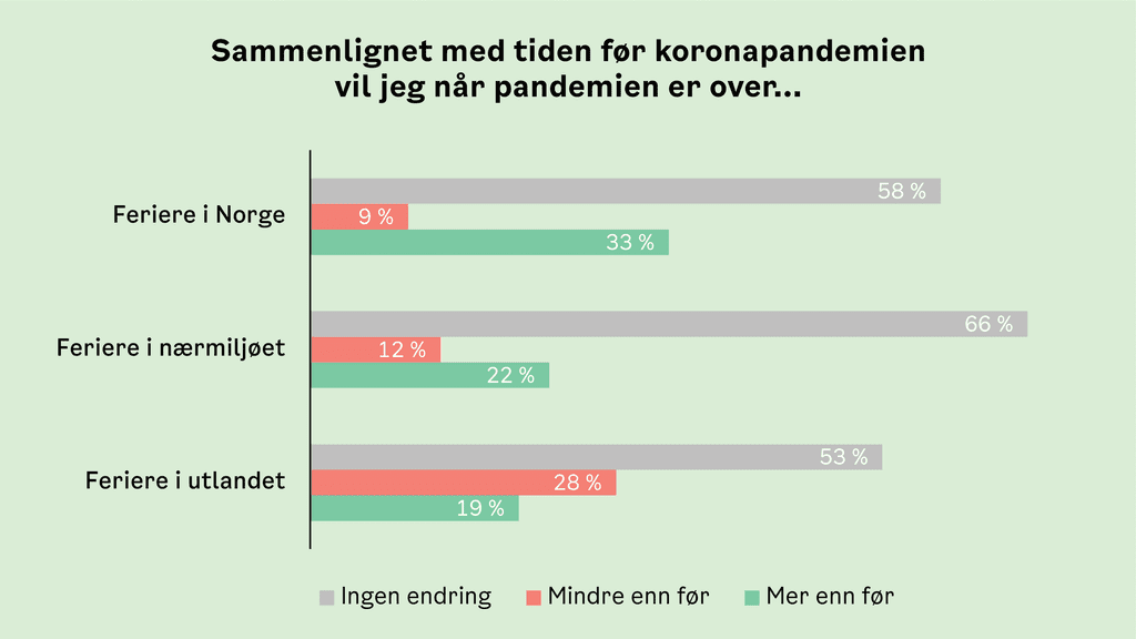 Flere svarer at de vil feriere mer i nærmiljøet og Norge generelt enn før pandemien, samtidig som flere opplyser om at de vil feriere i utlandet i mindre grad enn før.