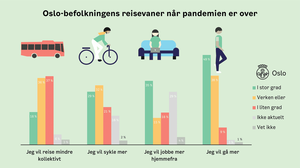 87 prosent av osloborgere oppgir at de enten allerede har begynt å gå mer eller planlegger å gå mer de kommende årene. Det er en økning fra 2020, da 82 prosent svarte det samme. Videre oppgir 59 prosent at de enten allerede sykler mer eller planlegger å sykle mer de to kommende årene. Det er også er en økning fra 50 prosent i fjor. Flere som planlegger å kutte i bilbruken. 44 prosent opplyser at de enten har eller skal kjøre bil mindre, en økning på 5 prosentpoeng fra 2020. Videre er det færre som planlegger å benytte seg av kollektivtransport til arbeid eller skole: I 2020 sa 2 av 3 (66 prosent) at de enten allerede har iverksatt eller planlegger å reise oftere med kollektivtransport til arbeid eller skole. I år har samme oppslutning falt med 11 prosentpoeng til 55 prosent.
