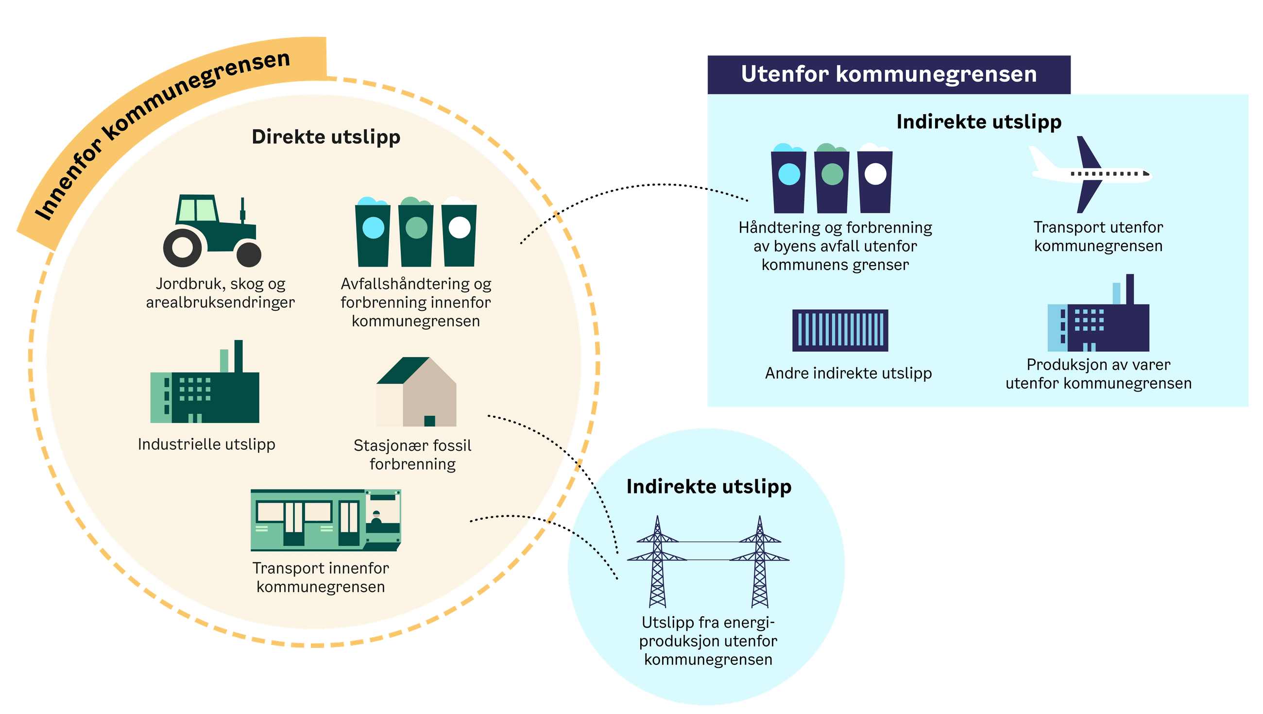 Oslo kommune, næringslivet og befolkningen bidrar til utslipp som oppstår innenfor kommunegrensa (direkte utslipp) og utenfor kommunegrensa (indirekte utslipp). GHG-protokollen (Greenhouse gas protocol) deler disse utslippene inn i tre «Scope». Oslos Scope 1-utslipp er direkte utslipp som oppstår innenfor Oslos grenser. Scope 2-utslipp er utslipp fra produksjon av energi utenfor bygrensa, men som brukes innenfor. Scope 3-utslipp er hovedsakelig utslipp fra produksjon og transport av varer og tjenester utenfor kommunens grenser, som drives av konsum innenfor bygrensa. Med indirekte utslipp videre i denne omtalen, er det sistnevnte det refereres til.