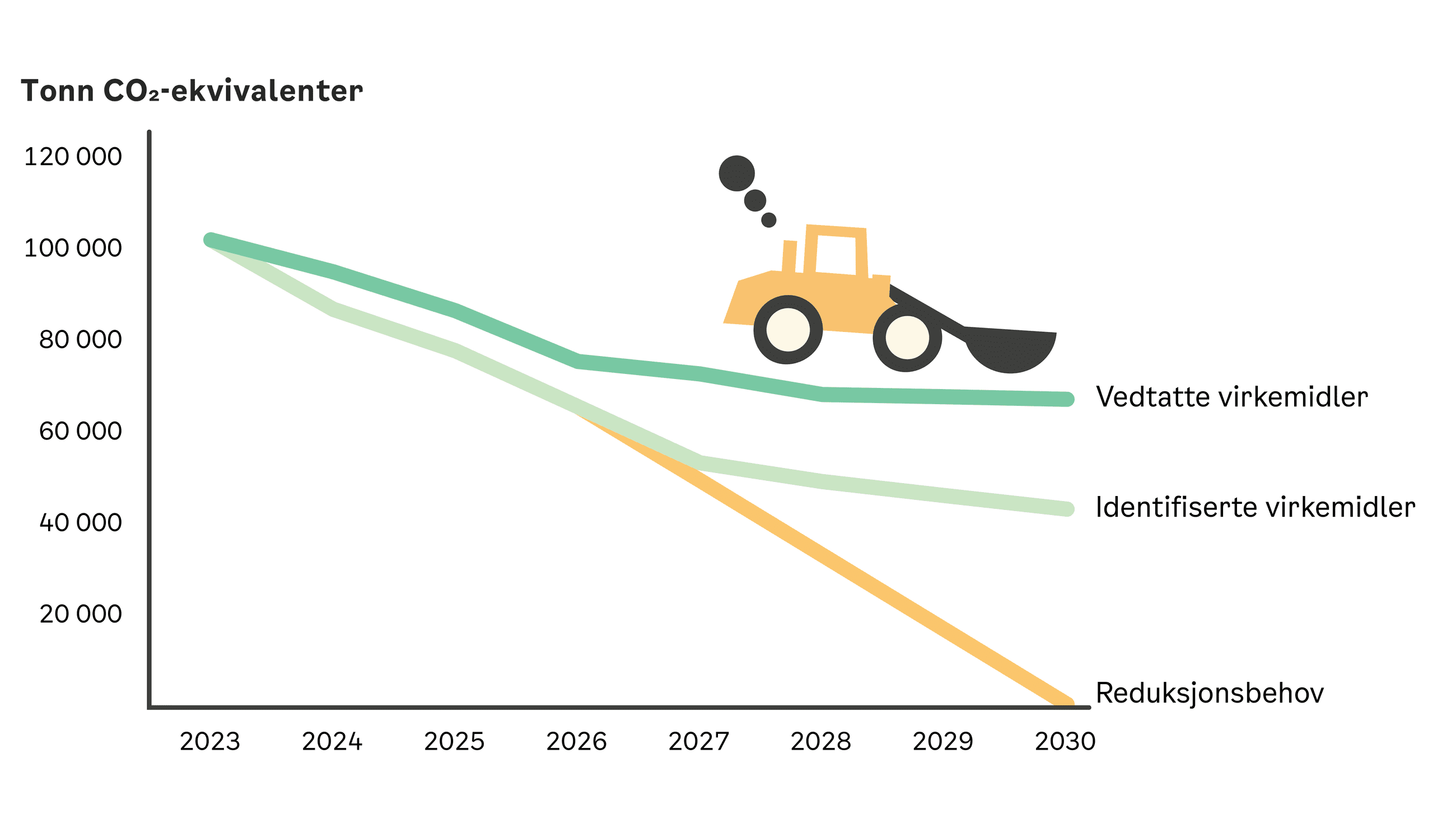Figur 5 viser at det er et anslått utslipp fra sektoren på i underkant av 100 000 tonn CO2-ekv. i 2023. Dersom alle vedtatte virkemidler blir gjennomført med antatt innfasing, kan utslippene bli redusert til rundt 67 000 tonn CO2-ekv. i 2030. Hvis de identifiserte virkemidlene også blir gjennomført, kan utslippene komme ned til rundt 43 000 tonn CO2-ekv. Dette tilsvarer en utslippsreduksjon på 67 % i 2030 sammenlignet med 2009. På grunn av omsetningskravet for anleggsdiesel på 10 %, og at et omsetningskrav opp til 35 % i 2030 er inkludert som et identifisert virkemiddel, har veikartet store endringer sammenlignet med det som ble presentert i Klimabudsjett 2023.