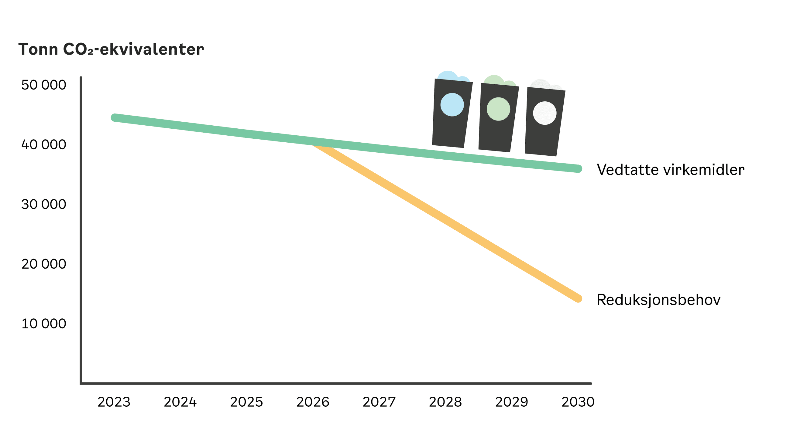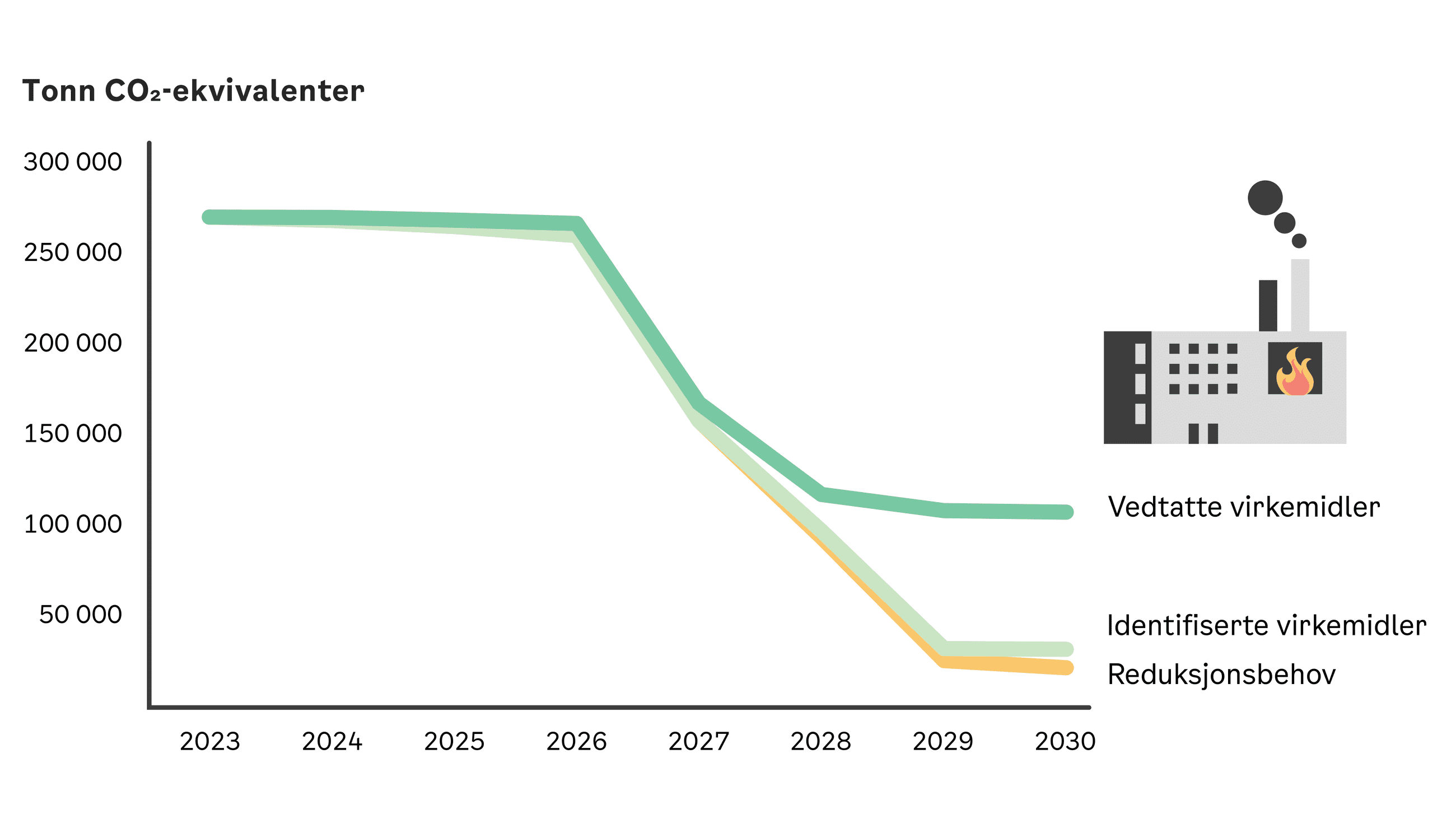 Figur 4 viser at det er anslått en relativt flat utvikling i utslippene fram til og med 2026. Fra 2027 antas det at utslippene reduseres betraktelig som følge av karbonfangst på anlegget på Klemetsrud. Med gjennomføring av de identifiserte virkemidlene (se omtale lenger ned) kan utslippet i sektoren reduseres med i overkant av 85% i 2030 sammenlignet med 2009 nivå. Karbonfangst er forventet å rense rundt 94 % av fossilt CO2, men det må også regnes med noe nedetid for anlegget ved nødvendig vedlikehold. Økt utsortering av plast og tekstiler kan gi ytterligere reduksjoner, men det vil fremdeles gjenstå noe utslipp av CO2. I tillegg, vil det være noe utslipp av metan og lystgass som er vanskelig å redusere. Dette medfører at det vil være rundt 32 000 tonn CO2-ekv. restutslipp i sektoren i 2030. Klimaetaten vurderer at utslippene fra sektoren må reduseres mer hvis det skal være mulig å nå 95 %-målet. For å redusere utslippene ytterligere er det nødvendig med en reduksjon i plastforbruk eller en økt utsortering og materialgjenvinning av plast før avfallet sendes til forbrenning. Dette gjelder spesielt plast fra bygg- og anleggsvirksomhet, men også fra husholdningsavfall fra nærliggende kommuner som forbrennes i Oslo. Det er ikke vurdert hvilke virkemidler som kan bidra til å utløse dette.