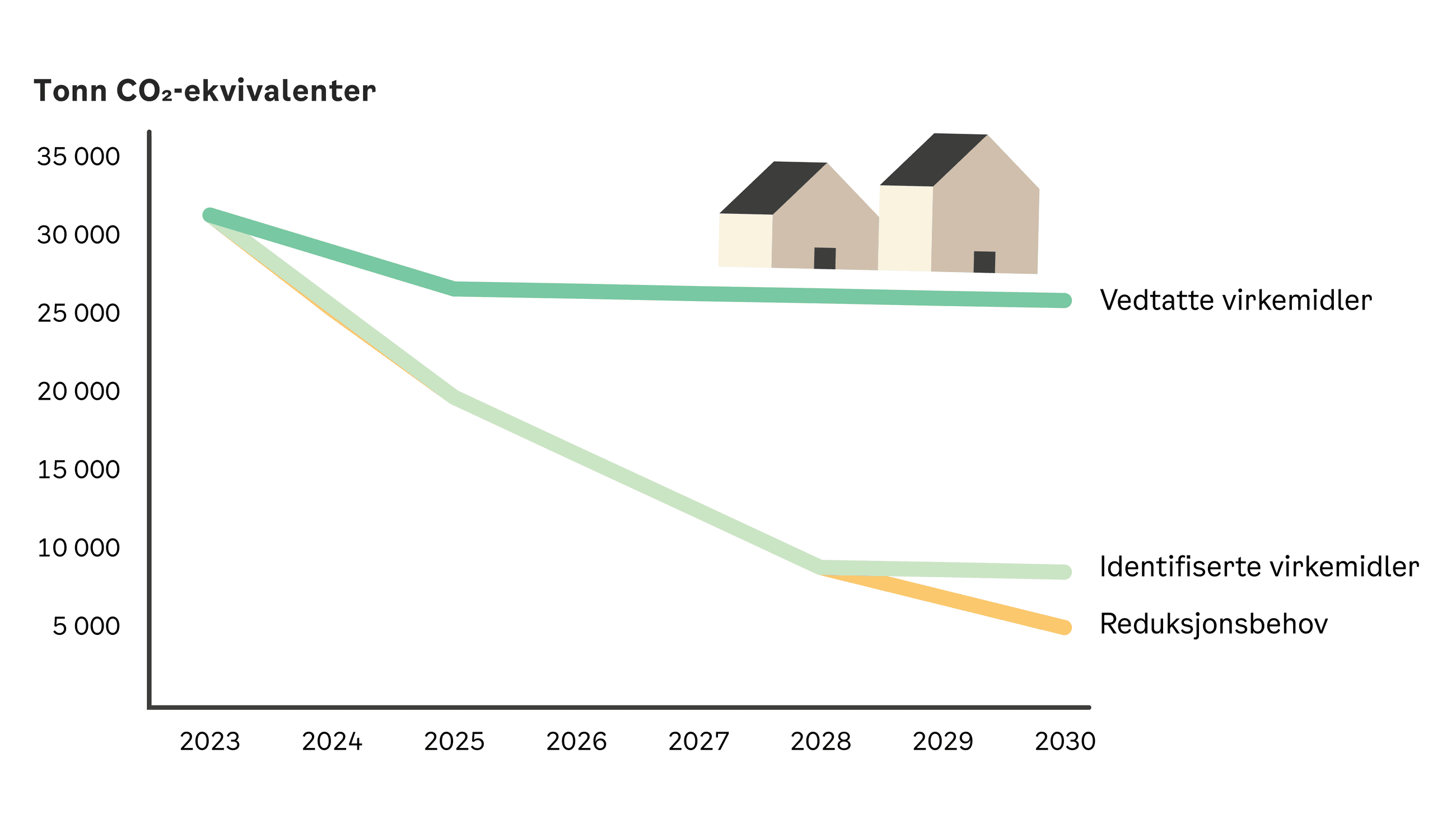 Det er alltid usikkerheter i beregninger som estimerer utslippsnivået frem i tid. Klimaetatens anslag viser at med dagens vedtatte virkemidler, kan utslippene reduseres med 63 % i 2030 fra 2009-nivå. Klimaetaten jobber systematisk med å bidra til ytterligere utslippsreduksjoner og har identifisert virkemidler som kan redusere utslippene med opp mot 79 % i 2030. Dersom disse identifiserte virkemidlene vedtas og iverksettes med full styrke kan Oslo komme langt på vei mot målet om 95 % reduksjon i utslipp, men det er likevel et utslippsgap på 16 prosentpoeng i 2030. Beregningene har betydelige usikkerheter, men viser en mulig utslippsutvikling. De identifiserte virkemidlene er beskrevet i kapittel 5.2.