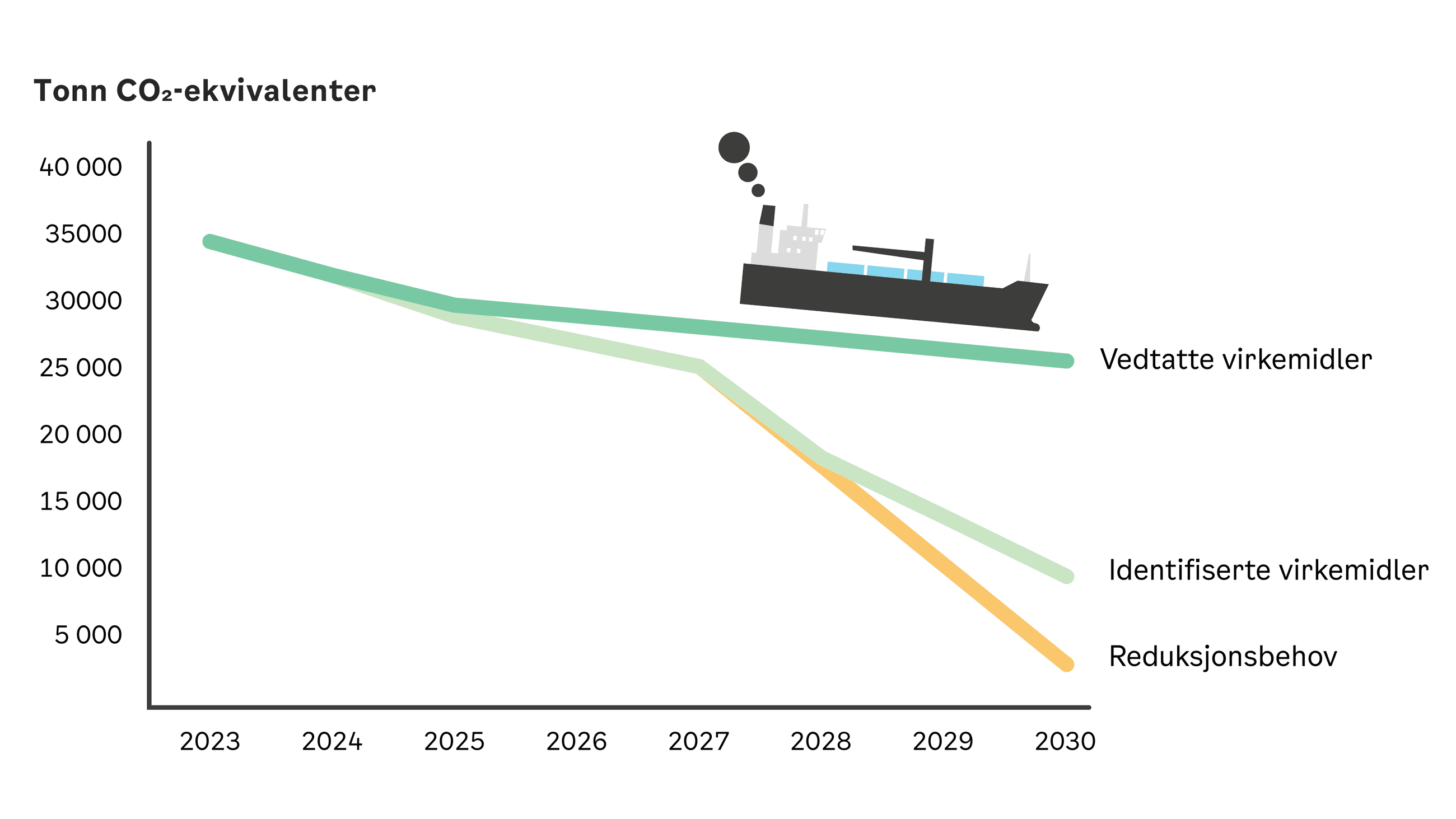 Figur 7 viser at med gjennomføring av de identifiserte virkemidlene kan utslippet i sektoren reduseres til rundt 9 500 tonn CO2-ekv. i 2030. Restutslippet i 2030 stammer primært fra inn- og utseiling av andre skip enn utenriksfergene. Effekten av det nye nasjonale omsetningskravet for biodrivstoff i sjøfarten er ikke inkludert i figuren, siden det antas at denne vil ha svært liten effekt på utslippene i Oslo. Skipene som trafikkerer Oslo Havn bunkrer hovedsakelig i andre land og vil dermed ikke påvirkes av det nye omsetningskravet.