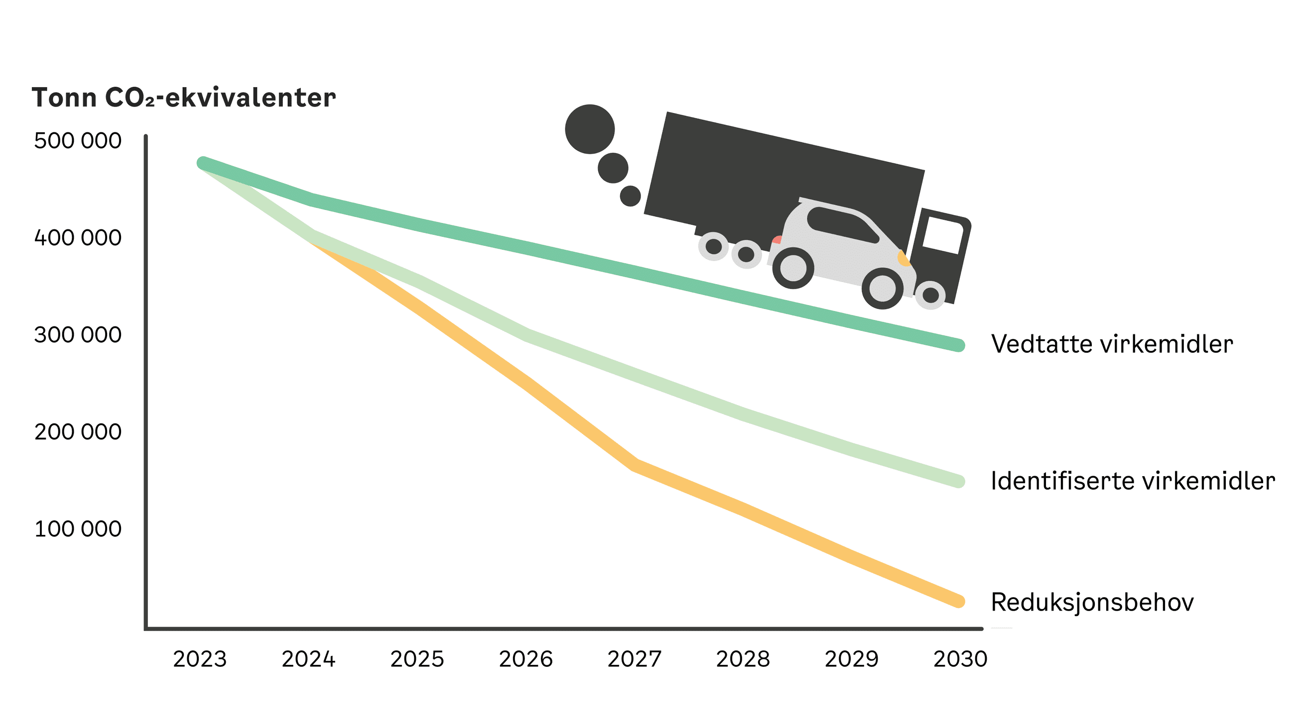 Utslipp fra lette og tunge kjøretøy sto for henholdsvis 34 og 18 % av de totale utslippene i Oslo i 2021. Dette tilsvarer 542 000 tonn CO2-ekv. Figur 3 viser at det er forventet at veitrafikk har utslipp på rundt 480 000 tonn CO2-ekv. i 2023. Dersom alle vedtatte virkemidler blir gjennomført med forventet innfasing, kan utslippene bli redusert til 290 000 tonn CO2-ekv. i 2030. Hvis de identifiserte virkemidlene også blir gjennomført, kan utslippene komme ned på rundt 150 000 tonn CO2-ekv. i 2030. Dette tilsvarer et utslippskutt i transportsektoren på 80 % i 2030 sammenlignet med 2009-nivå.