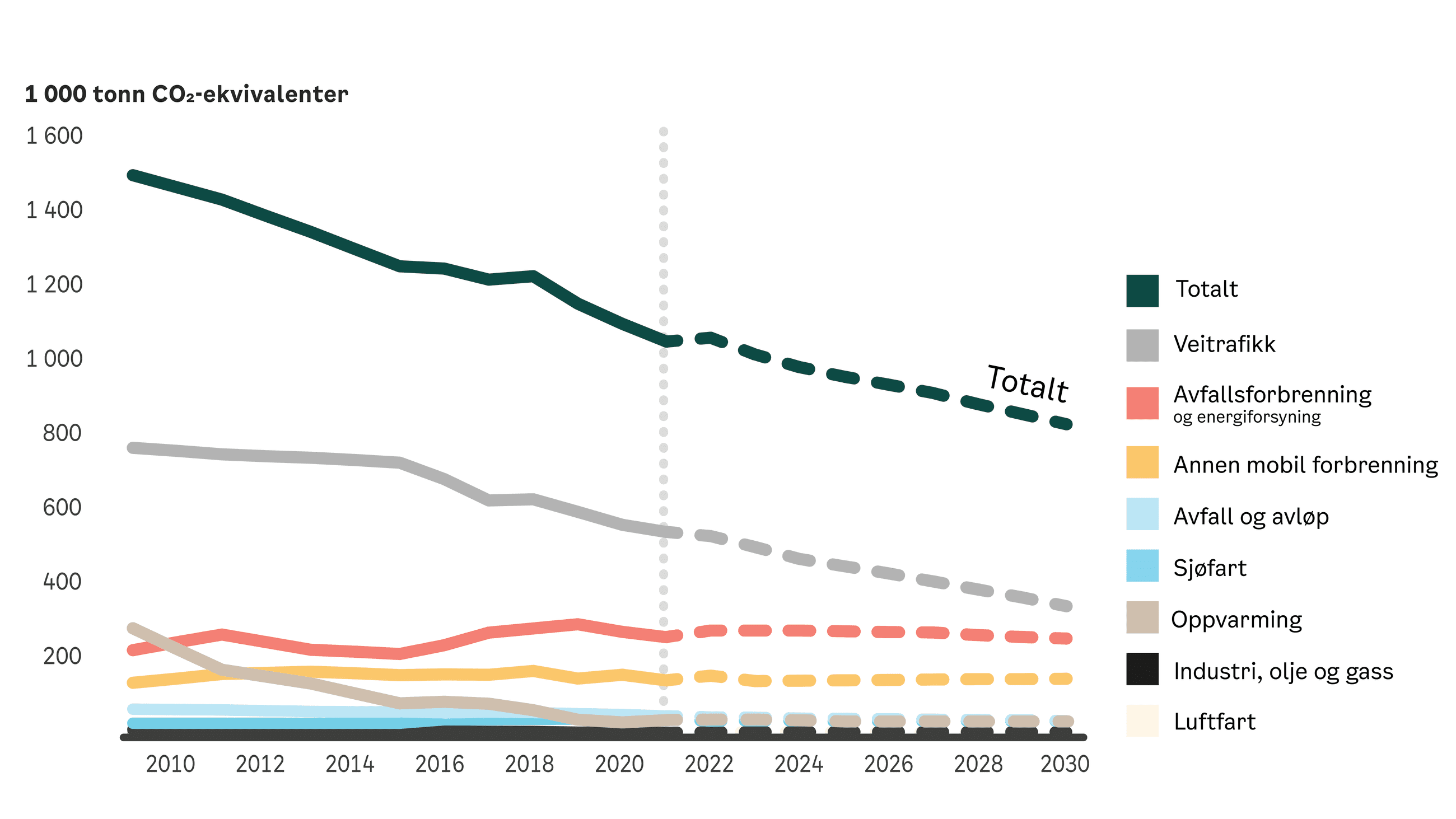 Figur 2: Historisk utslippsutvikling for årene 2009-2021 og utslippsframskrivninger for årene 2022-2030 uten ytterligere virkemidler etter 2021