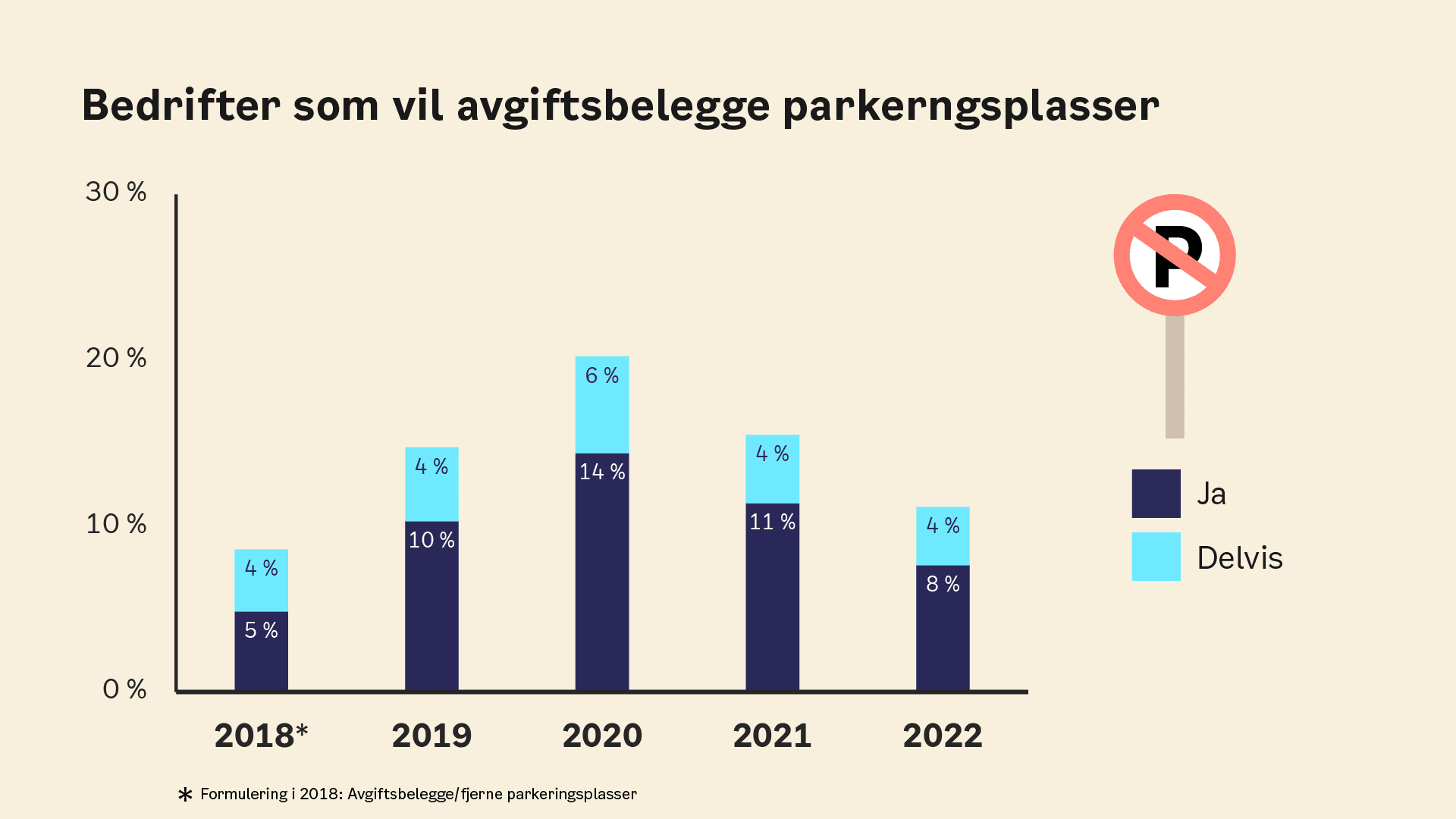 Når det gjelder avgiftsbelagte parkeringsplasser svarer 11 prosent at de helt eller delvis har innført dette. Det var en økning i andelen som har innført avgiftsbelagte parkeringsplasser fra 2018 til 2020 (fra 9 prosent til 21 prosent), mens andelen som har innført dette har falt i årene etter 2020.