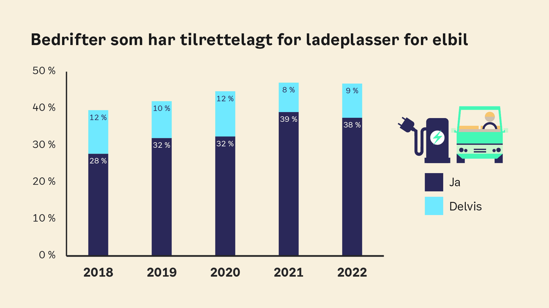 47 prosent har helt eller delvis tilrettelagt for ladeplasser for elbil, mens tilsvarende andel i 2018 var 40 prosent.