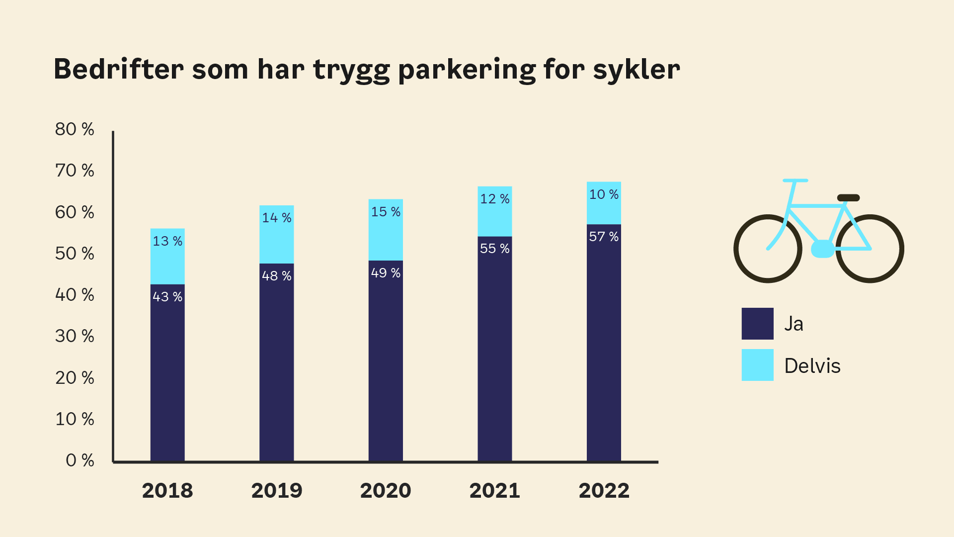 Økningen over tid har vært størst når det gjelder trygg sykkelparkering: 68 prosent av bedriftene har gjennomført eller delvis gjennomført dette, mot 56 prosent i 2018.