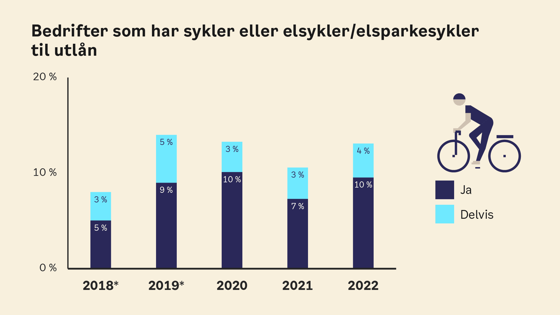13 prosent har helt eller delvis etablert ordning med sykler til utlån (8 prosent i 2018), mens 66 prosent har tilrettelagt for garderobe med dusj.