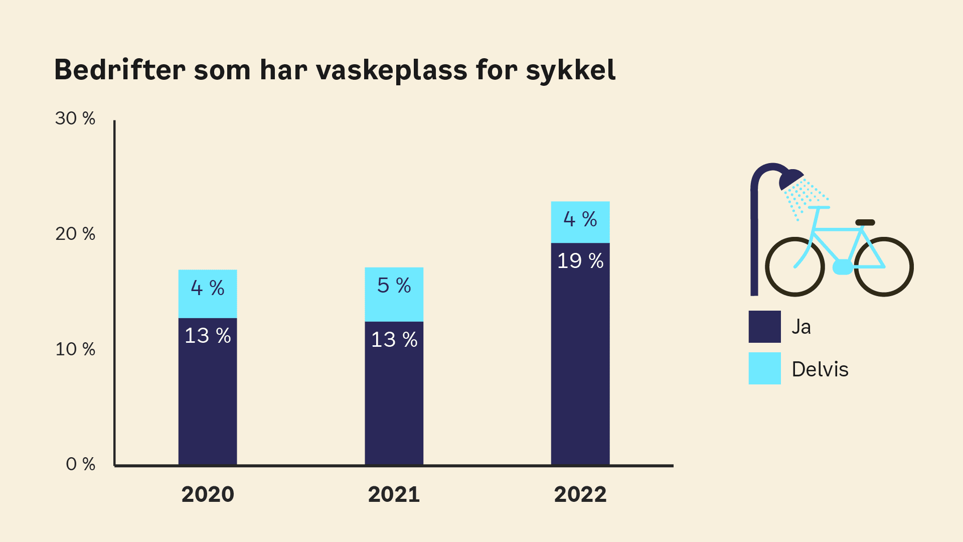 I tillegg har 23 prosent helt eller delvis etablert vaskeplass for sykkel, en økning fra 18 prosent i 2018.