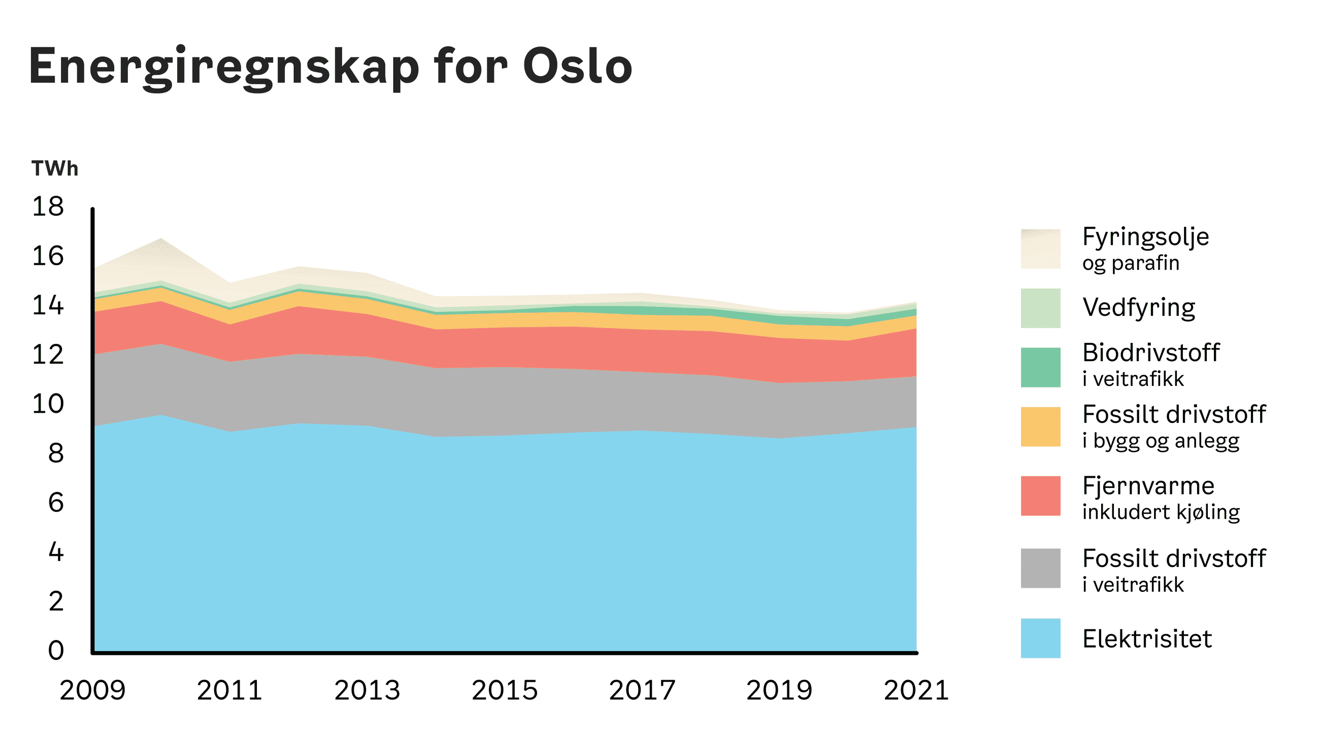 Det samlede energiforbruket i Oslo har gått ned med over 8 % fra 2009 til 2021. Nedgangen er hovedsakelig et resultat av elektrifisering av transportsektoren og forbud mot bruk av fyringsolje til oppvarming av bygg gjeldende fra 2020. Forbruk av de andre energivarene har holdt seg relativt stabilt siden 2009, til tross for befolkningsøkning på 21 % i samme periode.