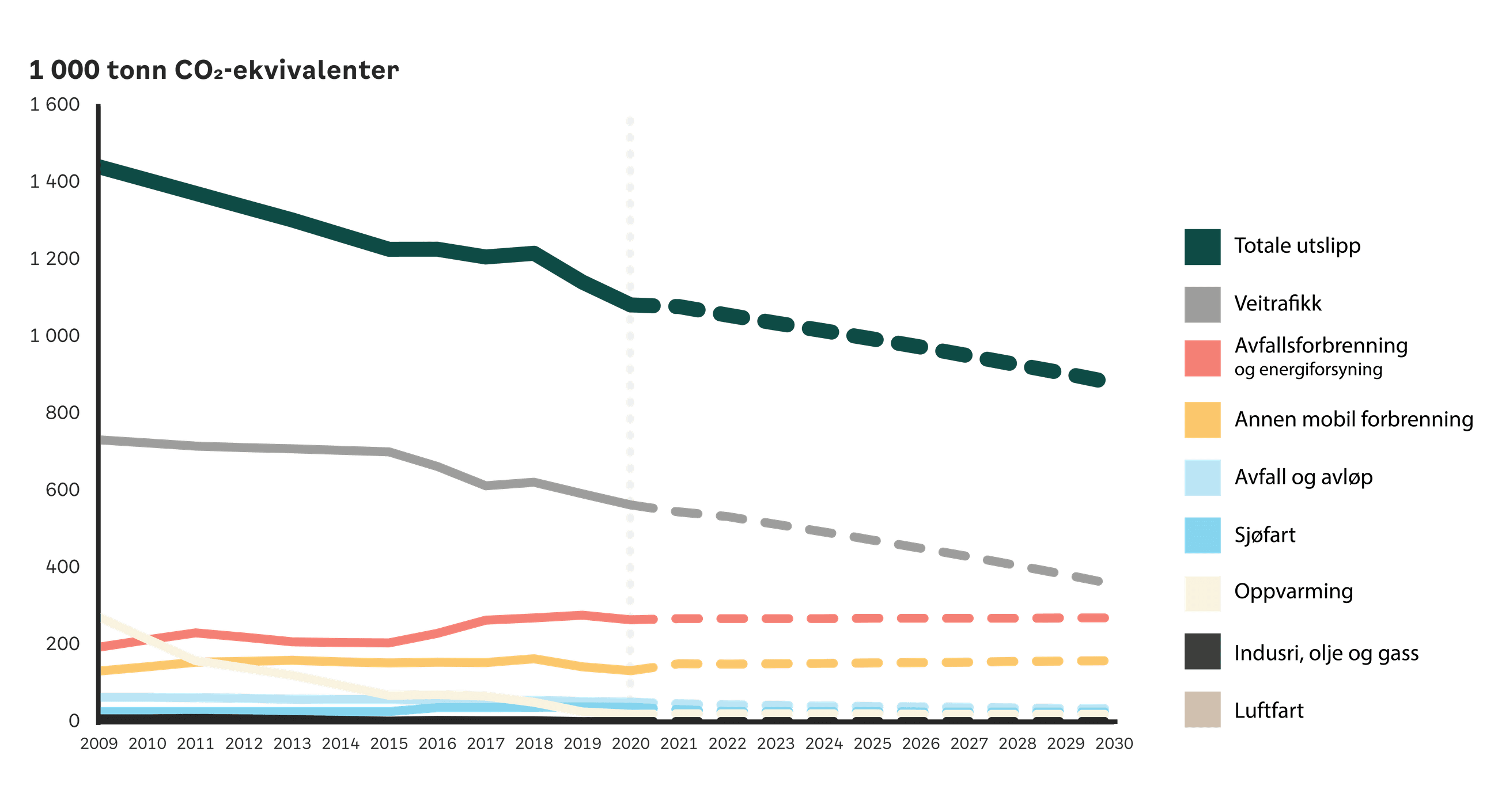 Veitrafikk anslås fortsatt å være den største utslippssektoren i 2030 med en videreføring av dagens virkemidler, men avfallsforbrenning og energiforsyning og annen mobil forbrenning er på god vei til å overta posisjonen som dominerende utslippssektorer i referansebanen. Samtidig er ikke virkemidler som karbonfangst på Klemetsrud og krav til fossilfrie byggeplasser med i referansebanen, og resultatet vil derfor kunne bli annerledes.