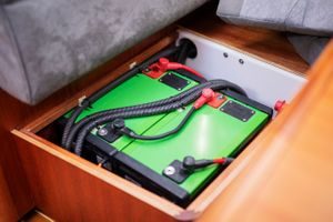 Her er ett av de to batteriene som er gjemt under benken i salongen.