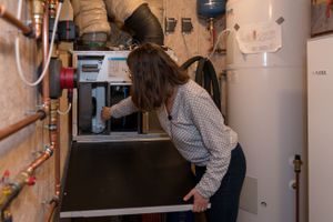 Karen Lindberg åpner luka til boksen hvor ventialasjonsanlegget ligger. Den varme innelufta varmer kald luft som kommer utenfra.