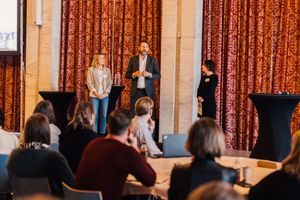 Byråd for miljø og samferdsel Marit Vea og byrådsleder Eirik Lae Solberg i samtale med sekretariatsleder for Næring for klima Ingunn Lie