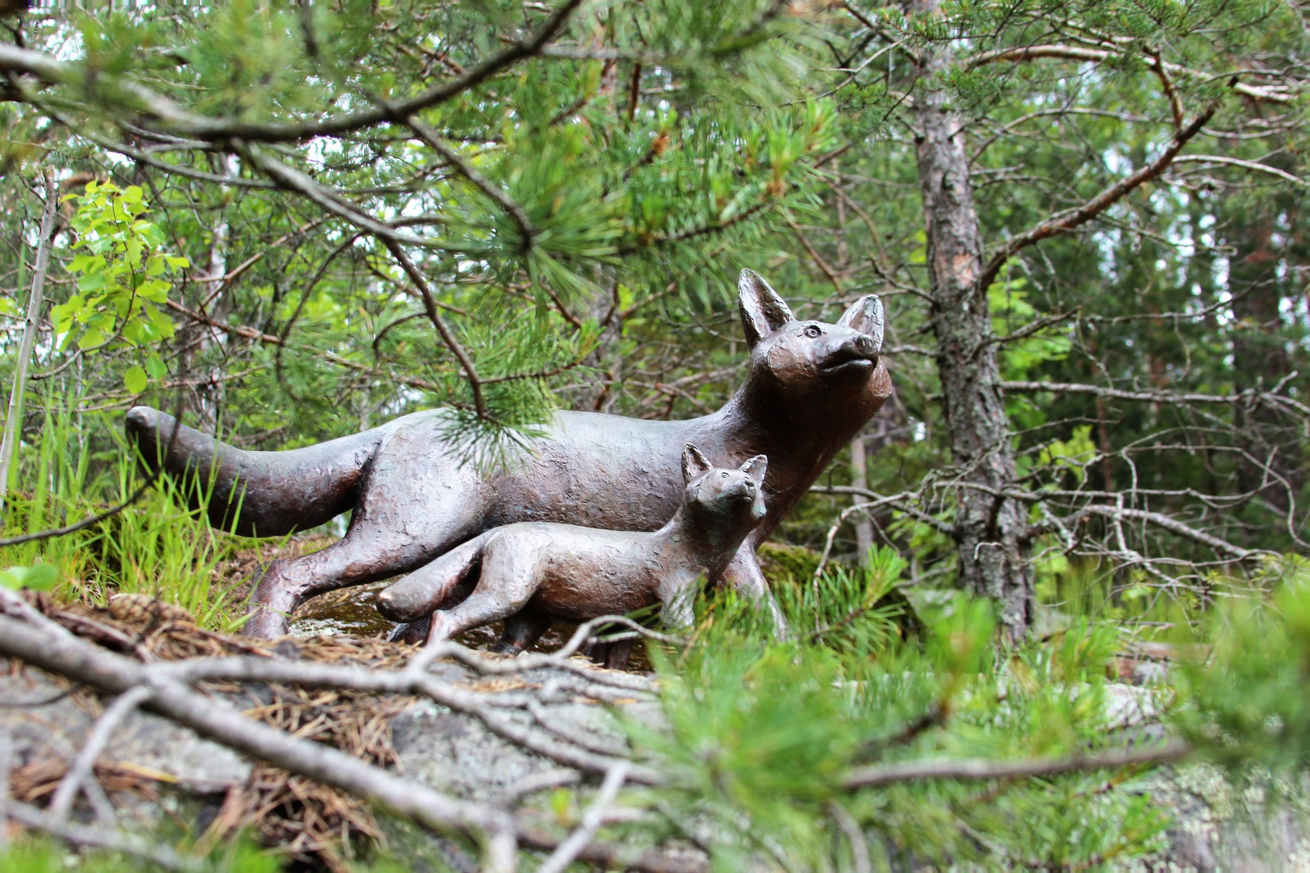 Revemor med reveunga, blant furutrærne på Smedstua. Skulpturen er laget av den kjente norske billedhuggeren Skule Waksvik.