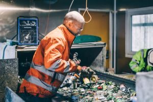 Også en manuell innsats må til når grovsorteringen av glass og metall begynner.